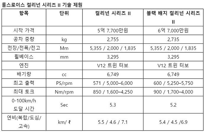 롤스로이스 컬리넌 시리즈 II 및 블랙 배지 컬리넌 시리즈 II의 시작 가격은 각각 5억7700만원, 6억7000만원이며(VAT 포함), 이달부터 순차적으로 고객에게 인도될 예정이다. 차량 및 비스포크 서비스에 대한 상담과 주문은 롤스로이스모터카 청담 쇼룸, 판교 라운지, 부산 해운대 전시장에서 가능하다.