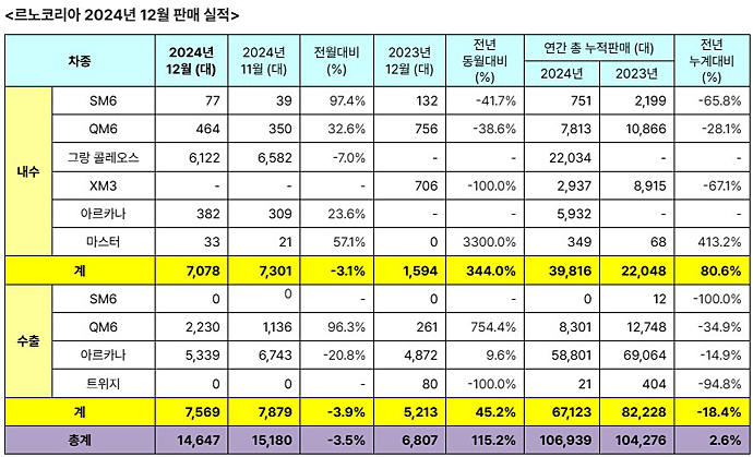 르노코리아가 지난해 12월 내수 7078대, 수출 7569대로 전년 동월 대비 115.2% 증가한 총 1만4647대의 판매 실적을 거두었다. 2024년 연간 판매 대수는 내수 3만9816대, 수출 6만7123대로 총 10만6939대다.