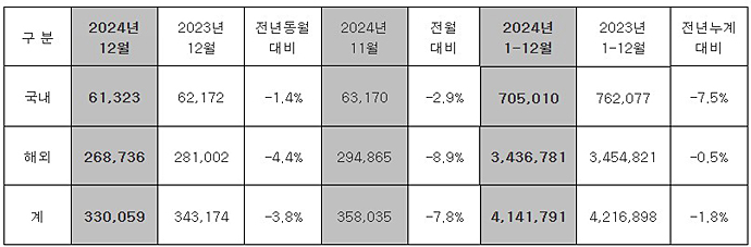 이는 지난 2023년과 비교해 국내 판매는 7.5% 감소, 해외 판매는 0.5% 감소한 수치다.